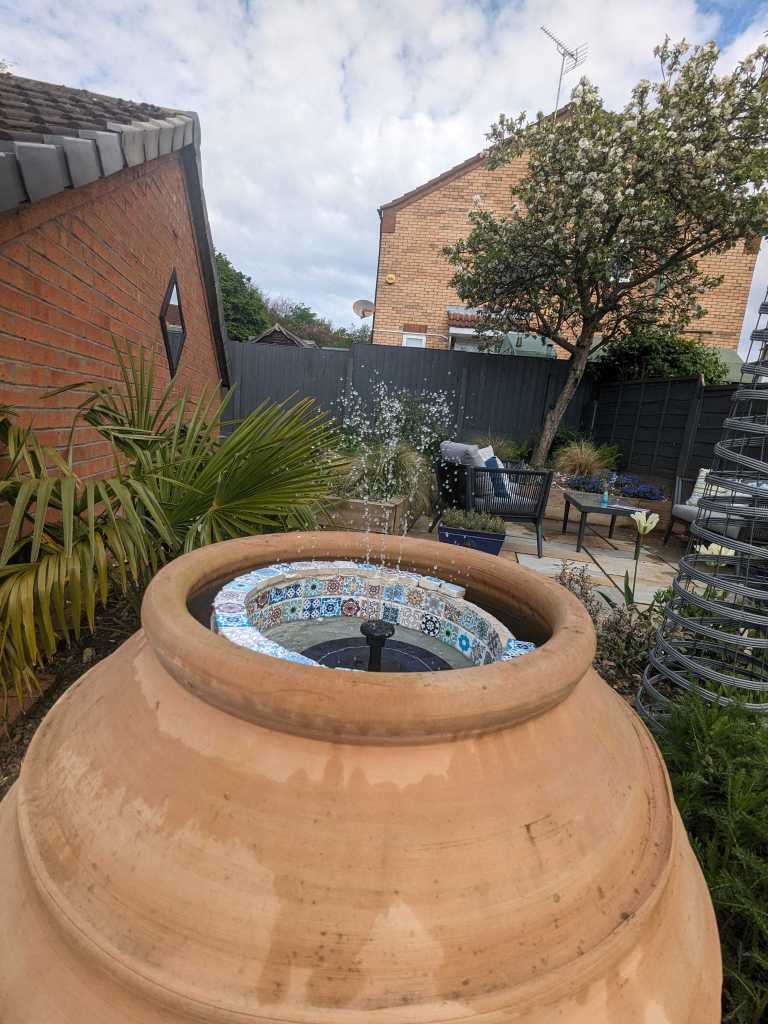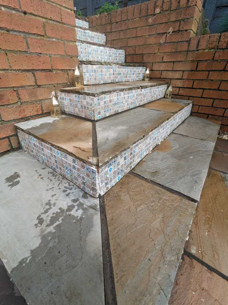 The space is split over 2 levels, and so the same pavers were used throughout to create one connected, whole space. Accents of blue in the pots and tiles highlight blue flowers in the planting bed and draw the eye further into the space.
